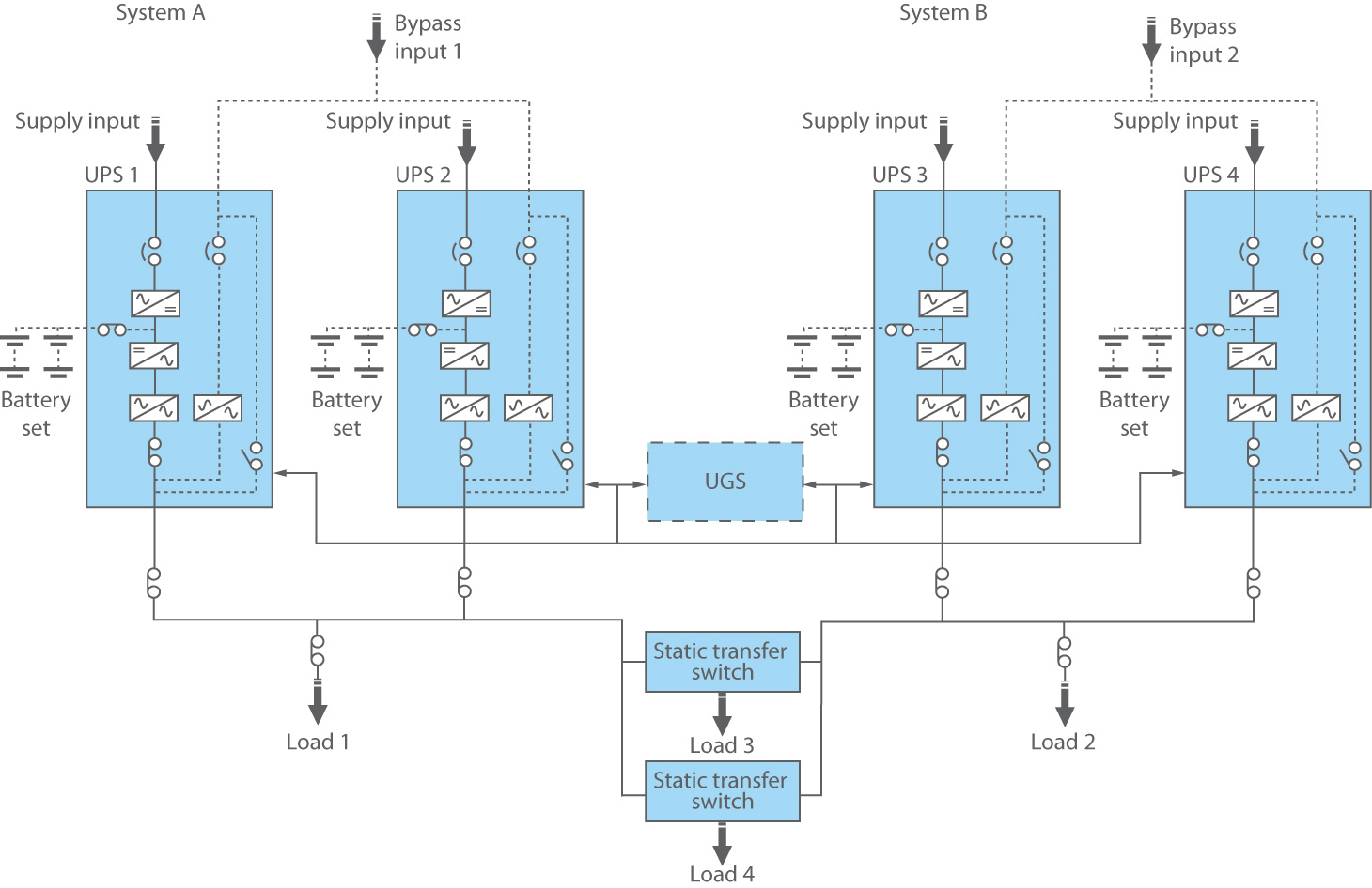 Adding a Static Transfer Switch (STS) to the output allows the protected load to be supplied from either of the two parallel groups. In such a configuration, if one of the groups fails, the STS transfers the load to the other (as long as there is spare capacity).